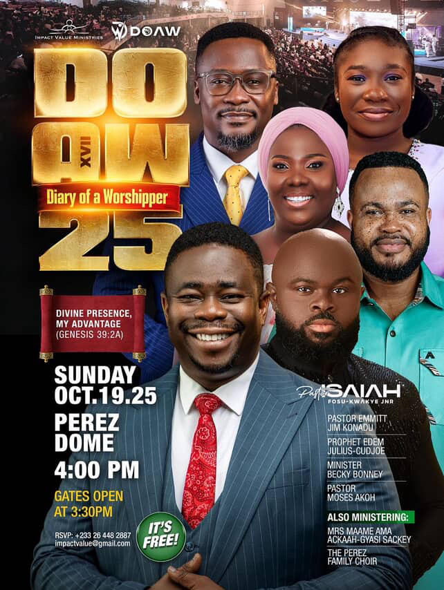 One of Ghana’s most anticipated worship gatherings, Diary of a Worshipper (DOAW 25), is back, and this year promises to be nothing short of extraordinary. Themed “Divine Presence, My Advantage” (Genesis 39:2a), the event is scheduled for Sunday, October 19, 2025, at the Perez Dome, Accra, with gates opening at 3:30 PM. Worshippers can look forward to a power-packed evening of praise, worship, and prophetic impartation — and best of all, admission is free!