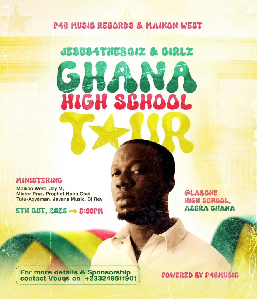 The excitement is building as P48 Music Records and Maikon West team up to present the much-anticipated Jesus4TheBoiz & Girlz Ghana High School Tour. This electrifying event is set to make a major stop at Labone High School, Accra, on Sunday, 5th October 2025, at 6:00 PM.